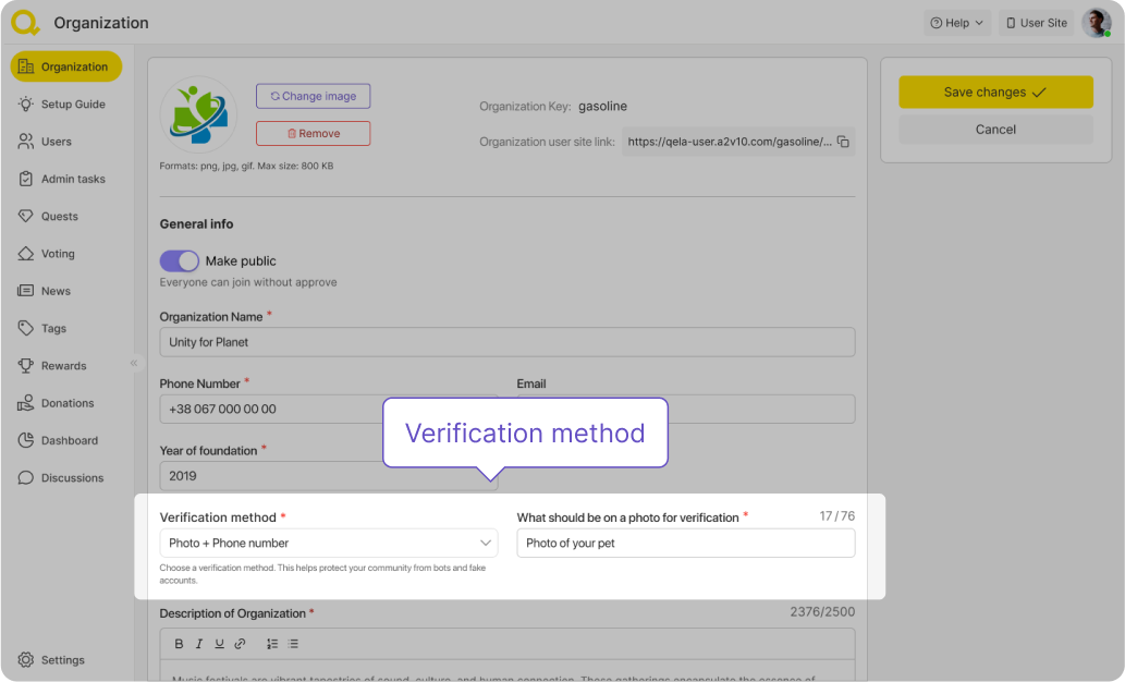 Upon registration, you need to choose a method that your organization will be using for verifying your volunteers (you will be able to change the selected verification method in the organization settings). You can do that by email, phone number, phone number and photo or by photo only. You can decide what should be in the photo. After you manually verify a supporter, their photos are being deleted from the server.